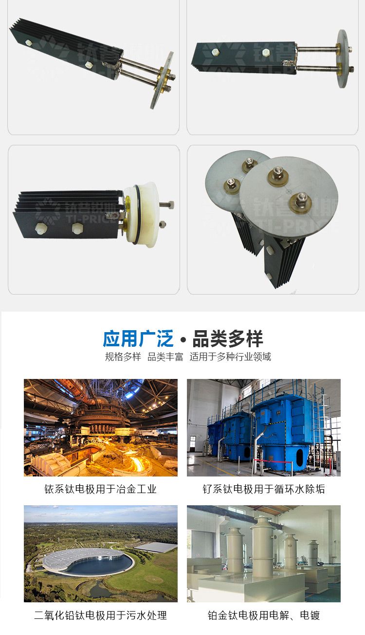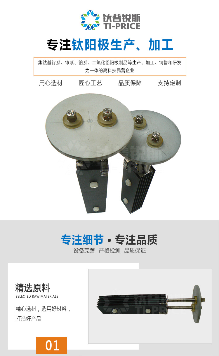阳极材料可以选用涂层钛阳极、混合氧化物涂层钛阳极,使用寿命长,此种涂层钛阳极的过电位也比较低,析氯电流效率高,节能效果好。次氯酸钠发生器用钛阳极多用铂、铱钌合金及钛镀铂阳极。